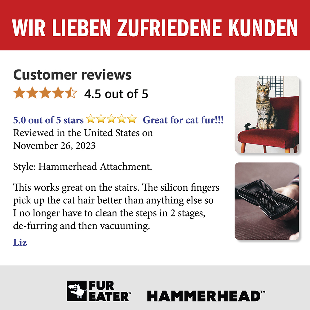 Der Fureater schafft, was noch nie richtig funktioniert hat, und ich habe schon einige Gadgets ausprobiert. Endlich kann ich auch die Hundehaare von der Couch entfernen. Großartig!