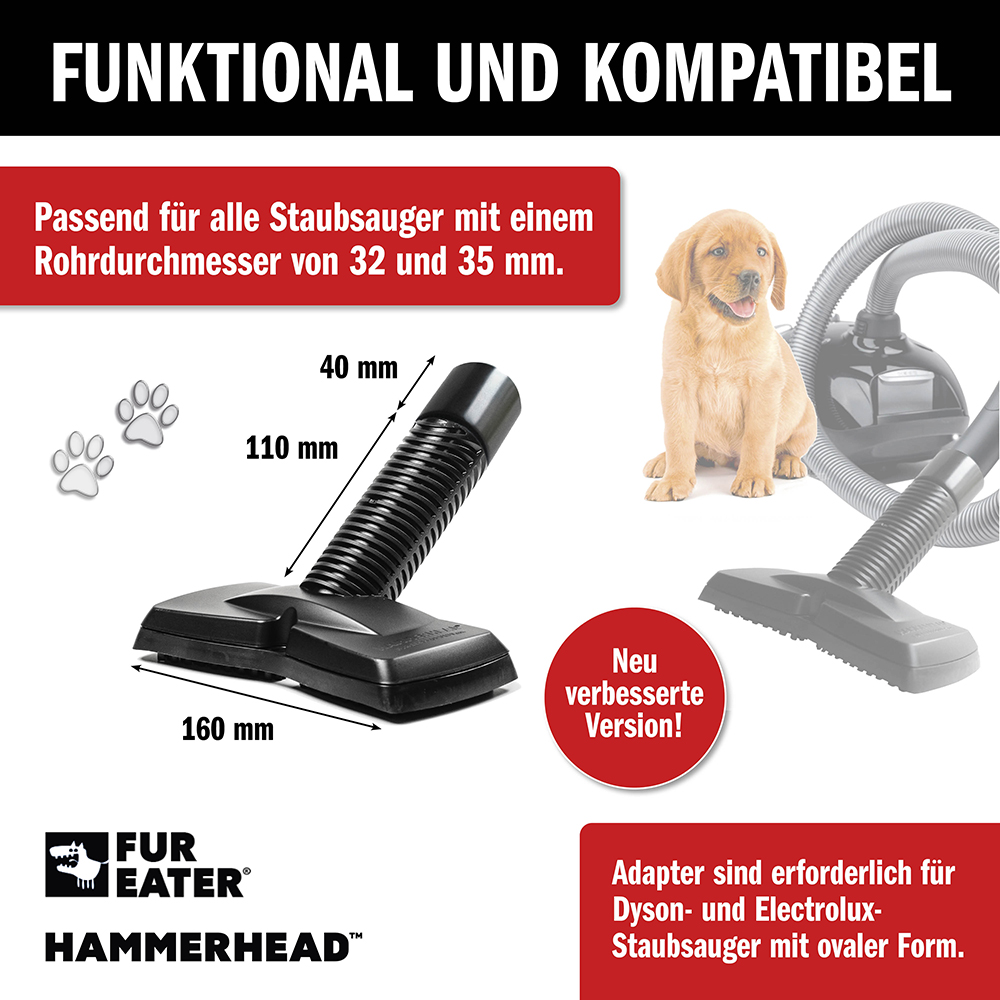 Der Fureater passt in 9 von 10 Staubsaugern (32 mm oder 35 mm). Er kann auch manuell als Pinsel verwendet werden.